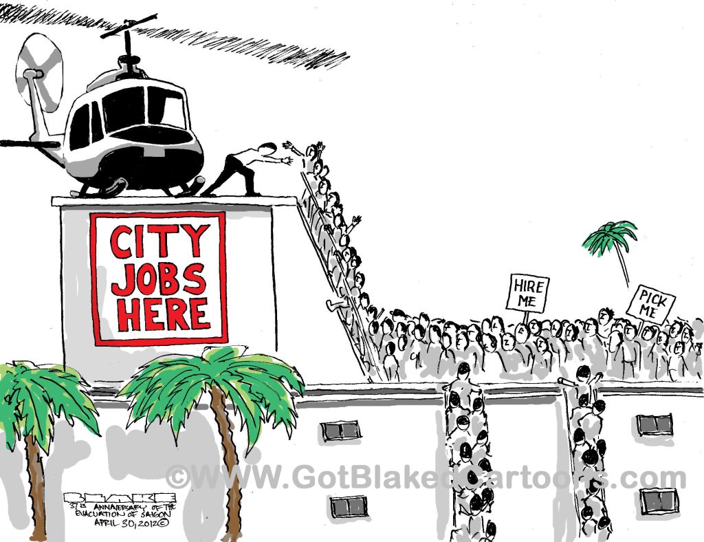 In 1975 the South Vietnamese government collapsed and the northern communists took over the entire country. As the communists were taking over the capitol city of Saigon, thousands of South Vietnamese attempted to flee the country. One iconic photo was of a US Huey helicopter on the top of the US Embassy. I used that image to show how many people wanted City of Phoenix jobs at the end of the 2008 financial crisis.