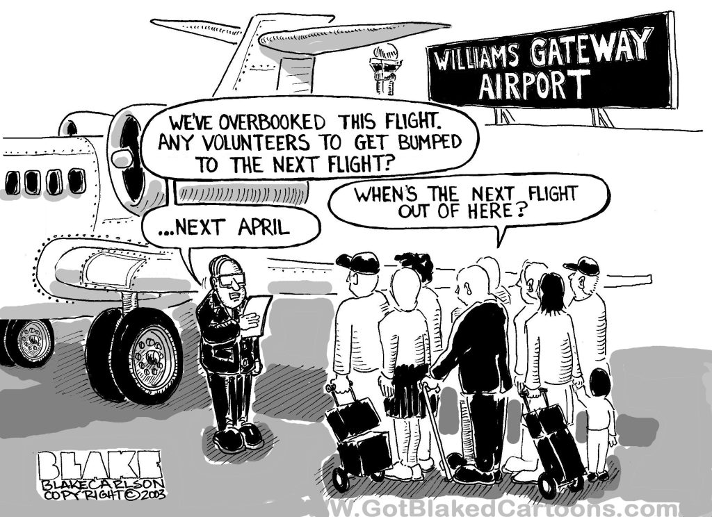 Mesa Williams Gateway Airport is the second commercial airport in the Phoenix Area. The main airline based there is the low budget Allegiant Airlines. Allegiant is inexpensive but it is also unreliable. If you’ve flown on Allegiant, you’ve been disappointed. I drew this in 2003. Wouldn’t you know that just last month I flew on Allegiant. The flight was delayed which caused me big problems. I guess I haven’t learned my lesson.