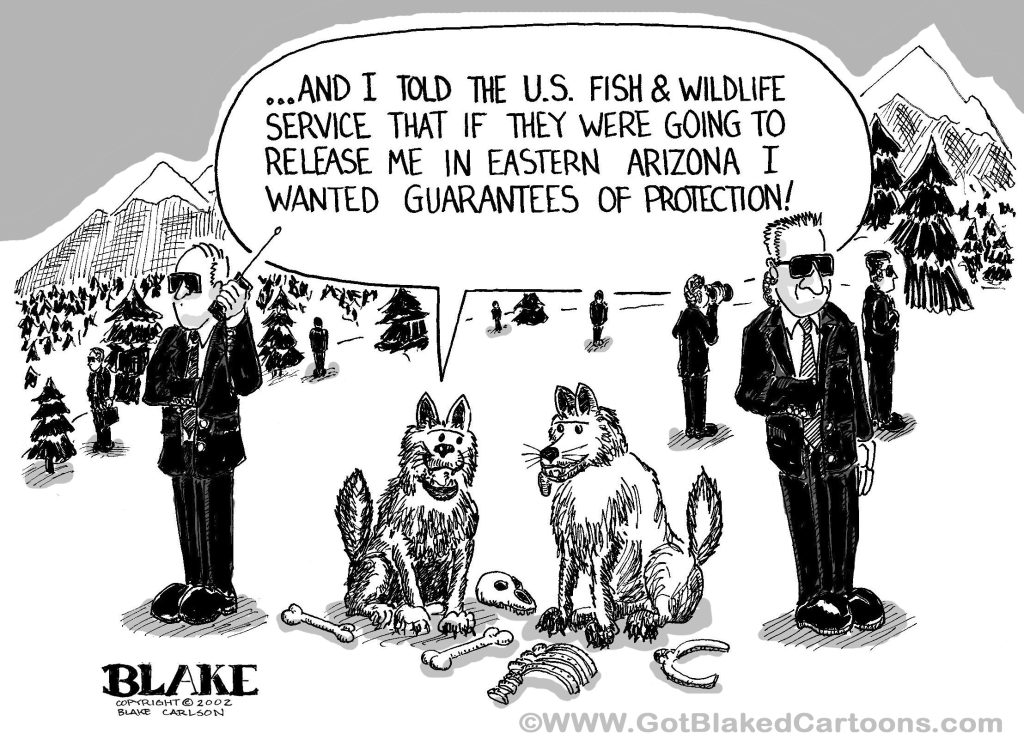 The re-introduction of the Mexican Grey Wolves to Eastern Arizona has been a hot topic. Ranchers are against it and left-wing environmentalists are for it. The poor wolves are caught between them. They needed their own Secret Service Protection. (This cartoon was printed in several newspapers in Eastern Arizona.)