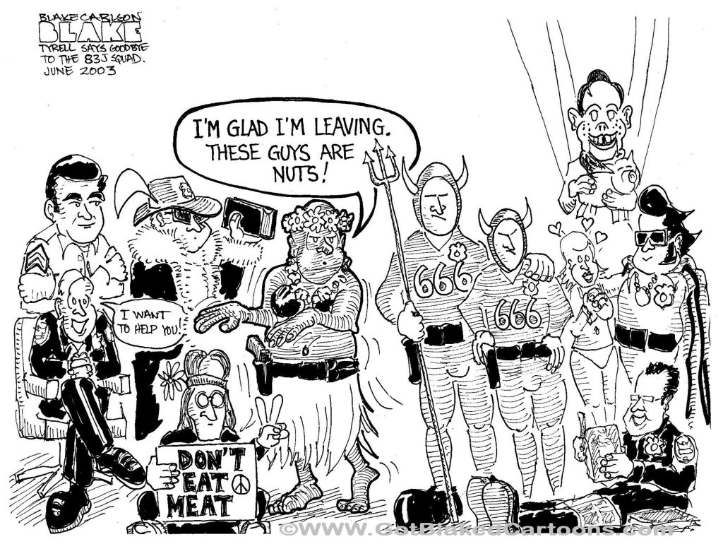 83J SquadBy Blake / May 18, 2025 In 2003, I was commissioned to draw this as a Christmas gift for the 83J squad members by their sergeant. Their Sergeant, Tyrell Jackson, was leaving the Department for a private sector job.
